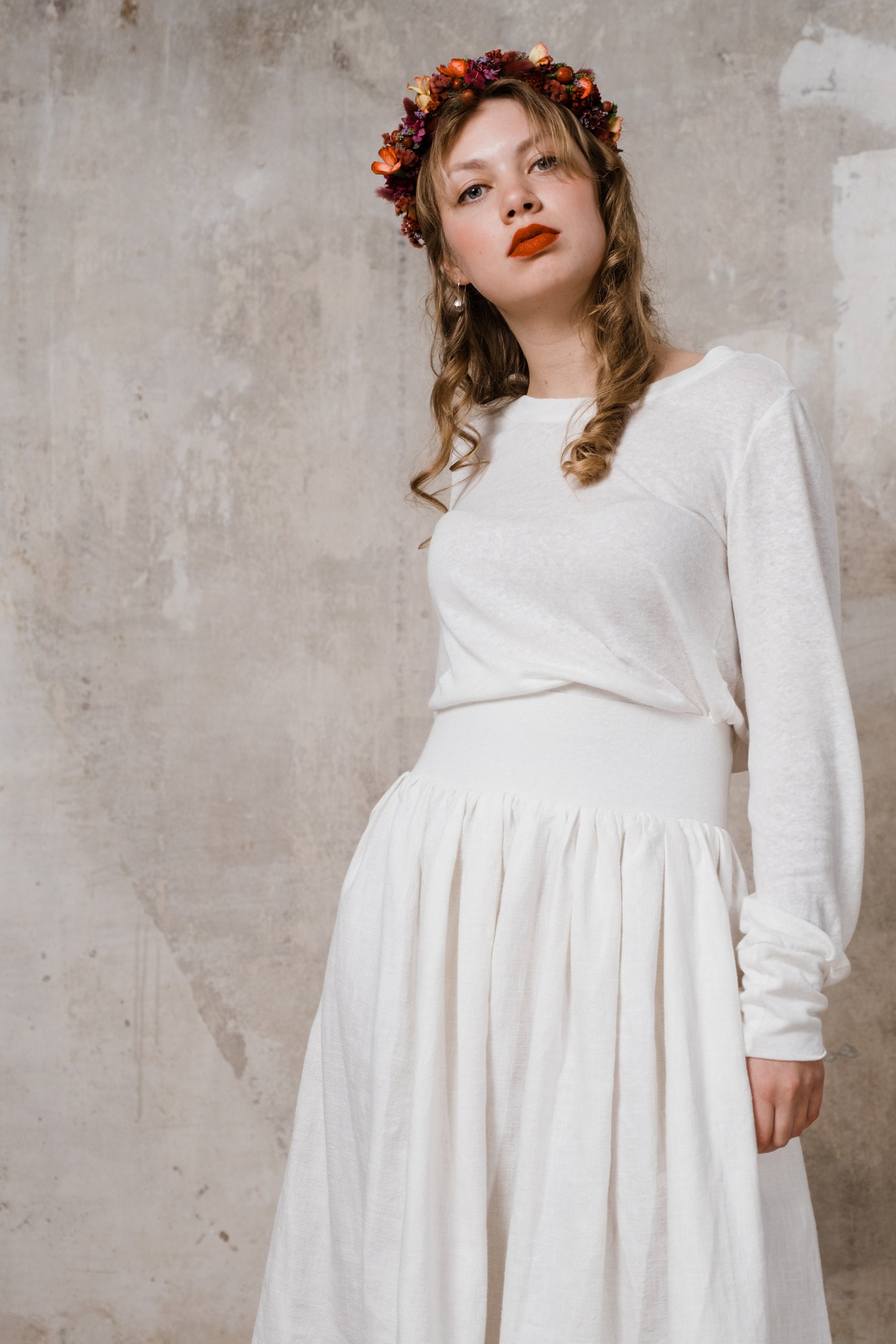 Lockerer Pullover aus leichtem, hautschmeichelndem Leinen-Viskose-Jersey in Cremeweiß. Der Pulli ist weit geschnitten und macht dein Brautoutfit besonders lässig.