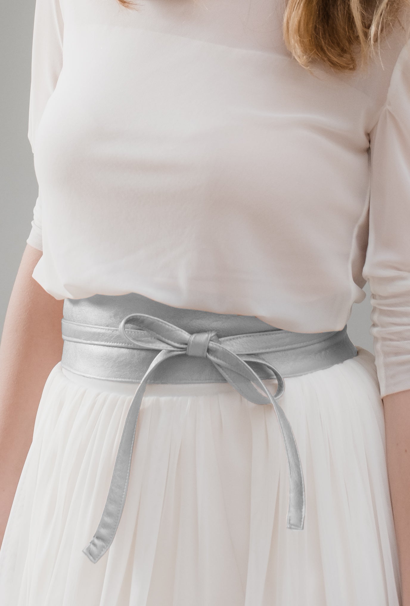 Ein eleganter, breiter Gürtel in schimmerndem Silber aus sehr weichem Kunstleder. Dieser Gürtel wird um die Taille gebunden und lässt sich mit einer kleine Schleifen oder einem Knoten schließen.Diesen Gürtel kannst du mit diversen Brautkleidern, aber auch den Sommer- und Winterkleidern kombinieren.