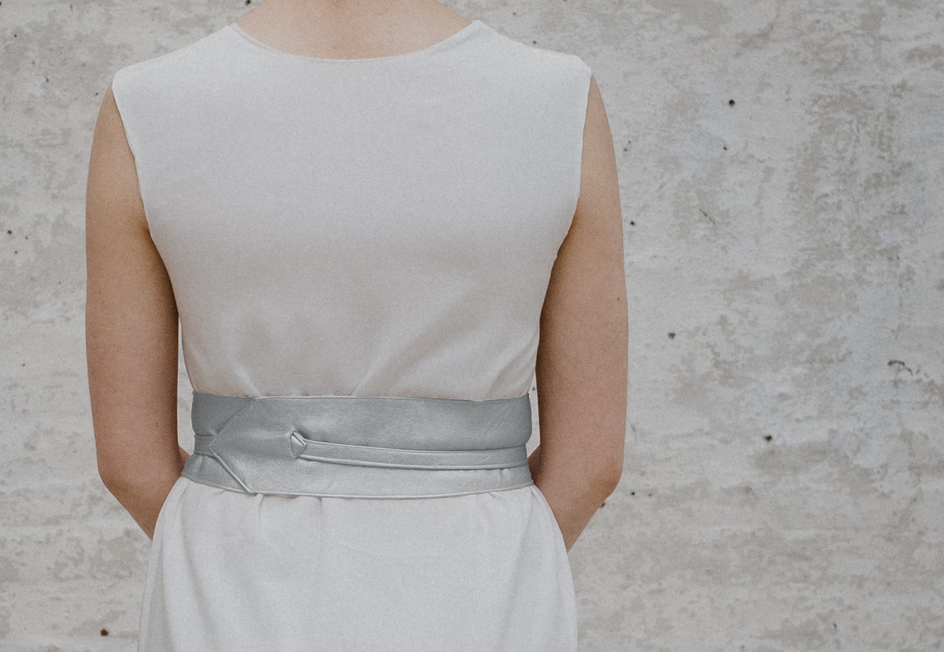 Ein eleganter, breiter Gürtel in schimmerndem Silber.