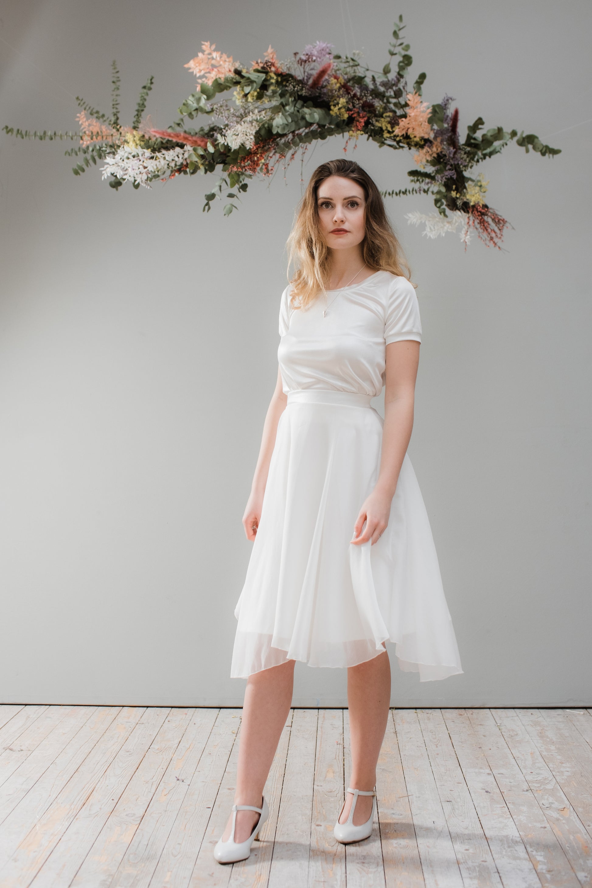 Elegantes Brauttop aus elastischem, cremefarbenem Satin. Es ist schlicht, mit kurzen Ärmelchen und besticht doch gerade damit als sehr elegant und legere zugleich.Es lässt sich mit den verschiedenen Brautröcken kombinieren. Hier ist es mit dem Rock Tinkabell kombiniert.