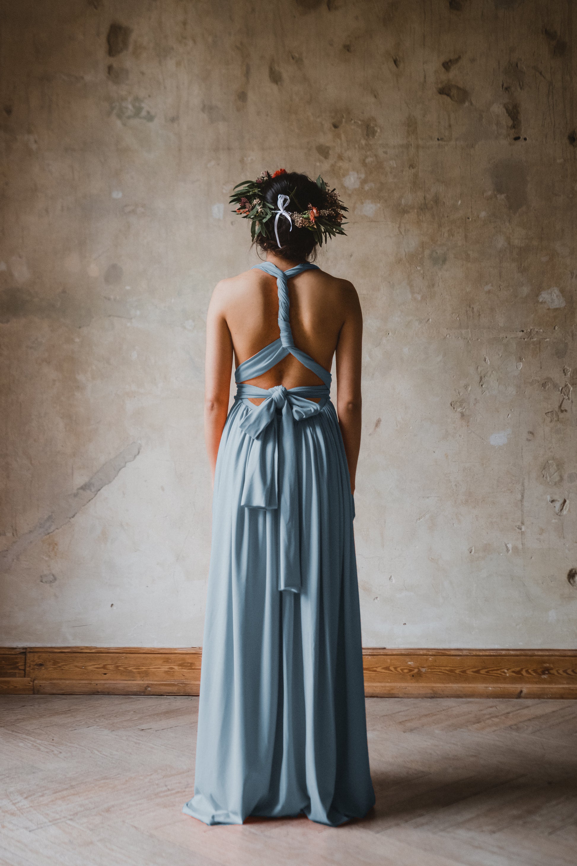 Bodenlanges Kleid in Salbei mit unzähligen Möglichkeiten es zu binden